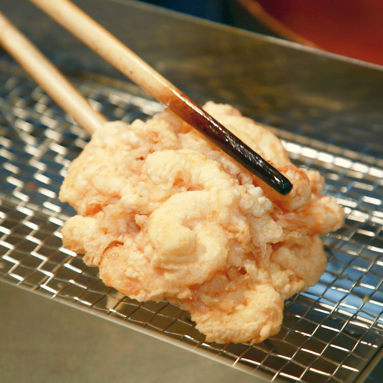 こうした天國ならではのかき揚は、タネを盛りたすことなく約三分間で揚げ切る、いわば一発揚げの妙技によるものです。
