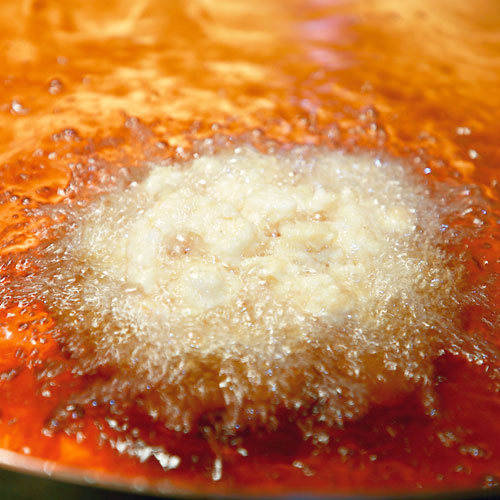 中までぎっしりとタネを詰め込みながら、お椀型に厚くふくらみを持たせ、しかも芯まで柔らかくふんわりと揚げる。