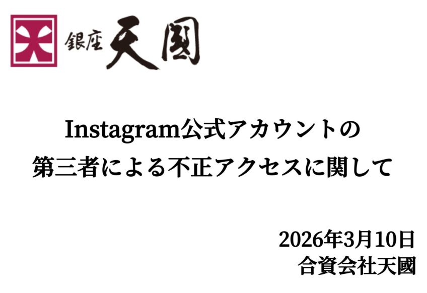 平素は格別のご愛顧を賜り、厚く御礼申し上げます。 この度、2026年3月9日(月)に、弊社が運営するInstagramの「銀座 天國」公式アカウント(ginza_tenkuni)において、第三者による不正アクセス(アカ...