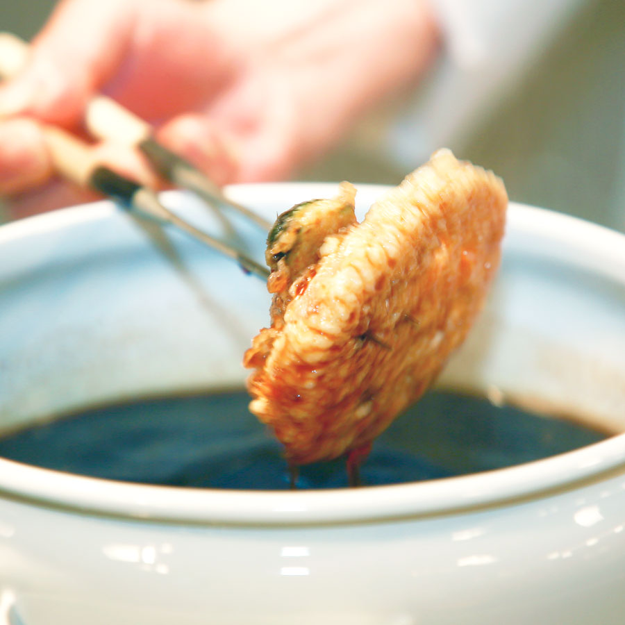 天國の江戸前天丼の命ともいえる丼たれは、常に火にかけ一定の温度をキープすることで、日々最高のコンディションを保ち続けています。”コクがあるのにあっさりした”その特有の旨味は、長年大切に培ってきた熟成の成果。